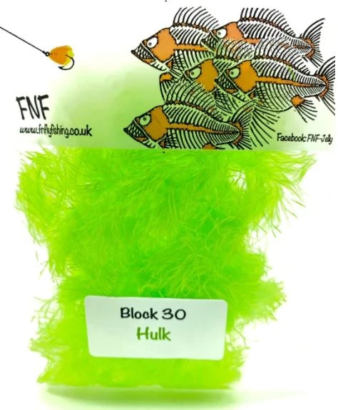 FNF have taken the original Block Jelly and increased the fibre length to 30mm for Block30 while maintaining all the great characteristics of its smaller brother. Block30 is mounted on a micro core making it very easy to use. The fibres have been cut to the smallest possible size allowing for maximum movement and more cut ends to fluoresce light. When the material is left static in the water like on the hang the fibres flair out. The use of Block fibre blended with our Jelly fibre gives Block30 its amazing characteristics.